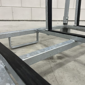 Voor opslag en transport van kozijnen, ramen, panelen, platen, deuren en meer. Deze grotere, enkelzijdige kozijnbok (ook wel glasresteel genoemd) is thermisch verzinkt en beschikt over beschermende rubber profielen. Let op: deze enkelzijdige glasbok dient ten allen tijden worden getransporteerd met de lepels/vorken aan de voor- of achterzijde, in de vorkgeleiders.